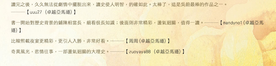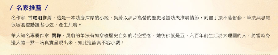 最後要特別說明的是,小說中有不少細節取自《葉榆稗史》《三迤隨筆》《淮城夜話》三部地方誌古籍。《葉榆稗史》的作者張繼白與段功的女兒段僧奴,是往來多年的至交好友;《三迤隨筆》的作者李浩與張繼白是姻親,且入明朝後接管所有大理藏書;《淮城夜話》的作者李以恆則是李浩的五世孫。這三位所寫的筆記可說是記錄大理歷史文化的第一手資料,彌足珍貴;在此特別向捐獻出這三部古籍手抄稿的李?先生(李浩的後人)表示深深的敬意,若非他的慷慨義舉,這三部書至今尚不為世人所知——斯人雖逝,俠名永留。