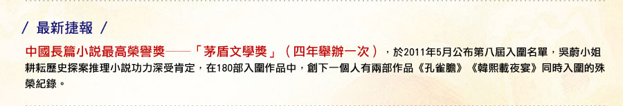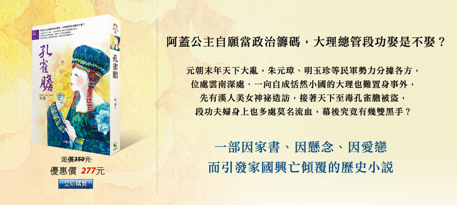 之前寫的兩部小說《魚玄機》和《韓熙載夜宴》,從故事發生到結束,時間很短,這次想寫一個有時間跨度的故事,因而選取了孔雀膽的題材。由於小說所發生的背景獨特,不可能會有專業司法人員以詳細取證來破案,所以本小說的結構又跟以往兩部不同,不再完全靠懸疑和破案去推動情節,而是以人物的命運為主線。
