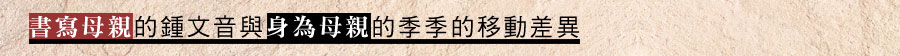 沒有其他人的參與,所以,我只能藉由母親的記憶來書寫她的城市經驗與變化。我們這一代作家,尚未將記憶烘焙出時間厚度。所以寫來寫去都是寫自己的「當代」,比較少述及歷史,敘述的時間長河也沒有拉開,頂多就是寫到童年而已。但我想,我需要努力的正是把記憶烘焙出時光的深度,讓記憶可以跨越「個我」,而逐漸走向一個更遠更遠的遠方。